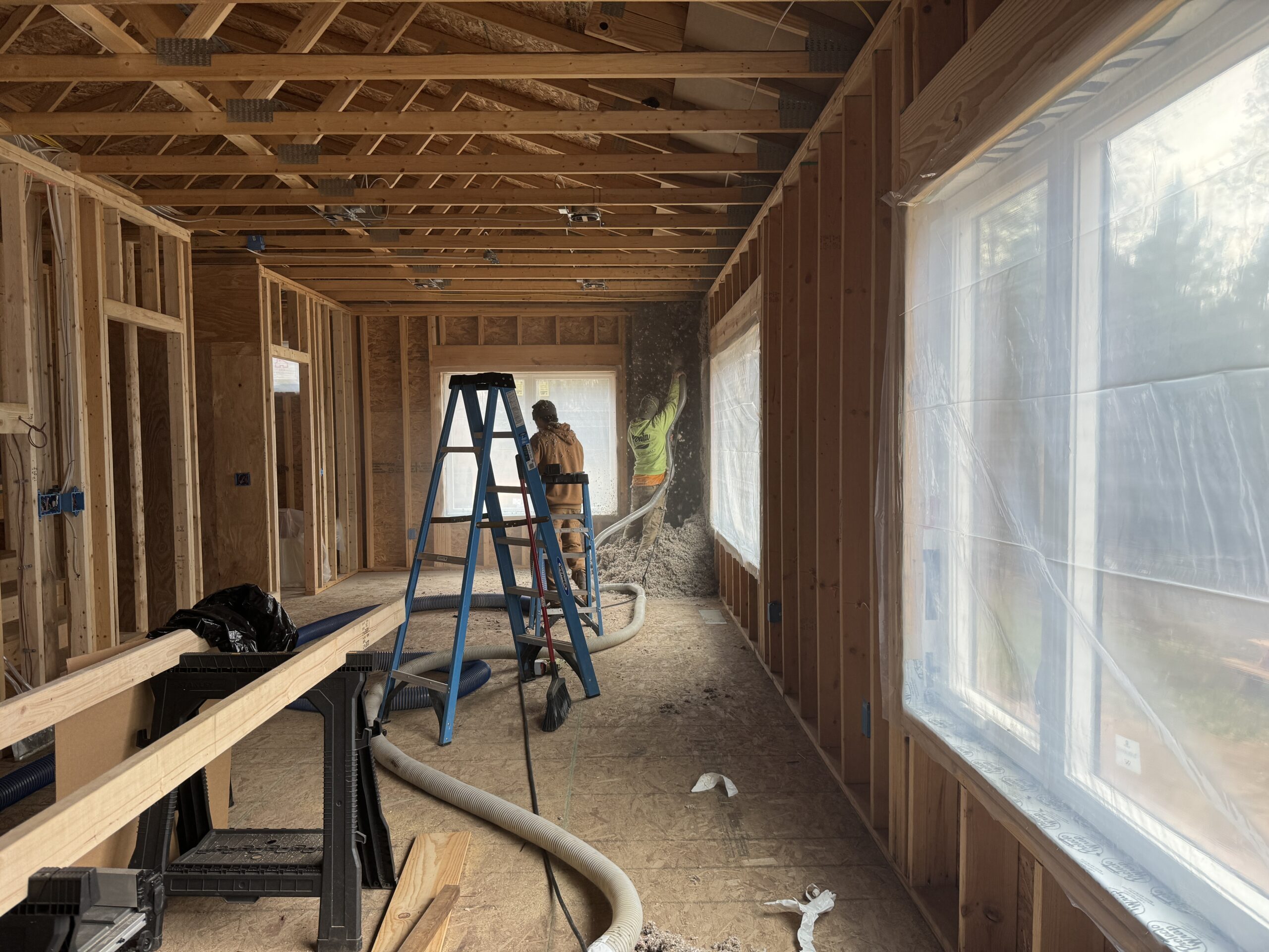 We dialed in the blower settings and made sure that the tip sizes were appropriate for the material they were spraying. We set the pump to 400 psi and it made for a very nice, fast-moving job. The crew already spray foam, so their technique quickly adapted to the wall spray system.