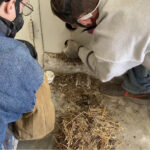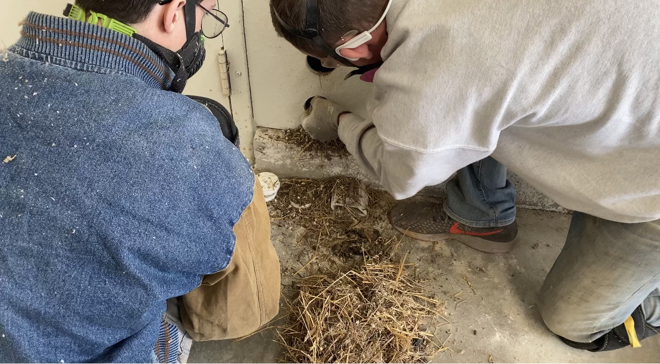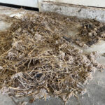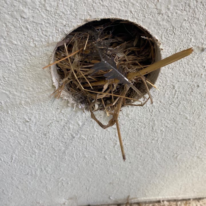 The homeowner recently purchased the home and added new siding to the house. The previous owner allowed birds to nest in the soffit areas. In one section of the wall, we found 10 dead birds and a nest that filled 6 feet of two wall cavities. We spent time removing the nest debris as well as the carcasses.