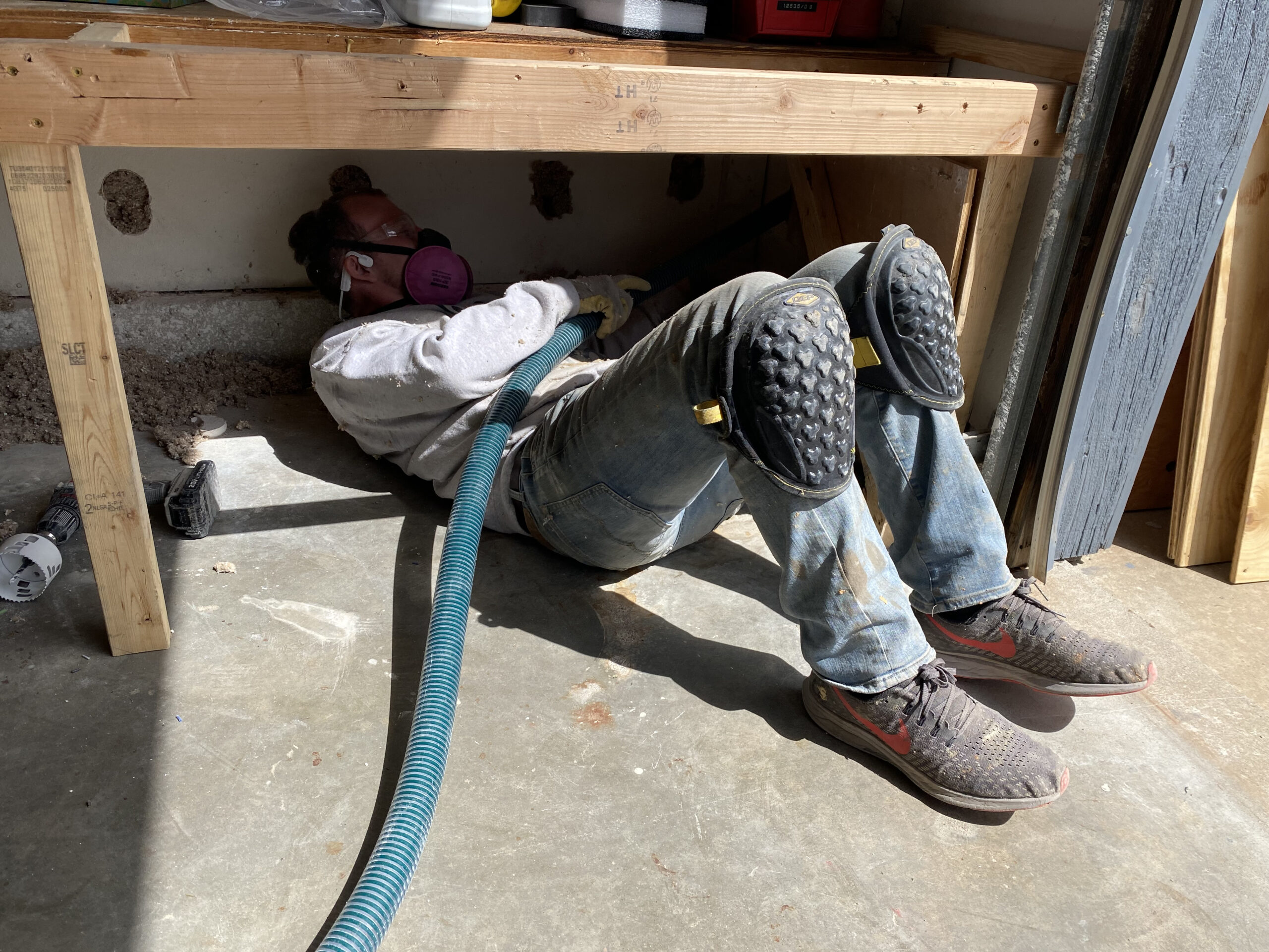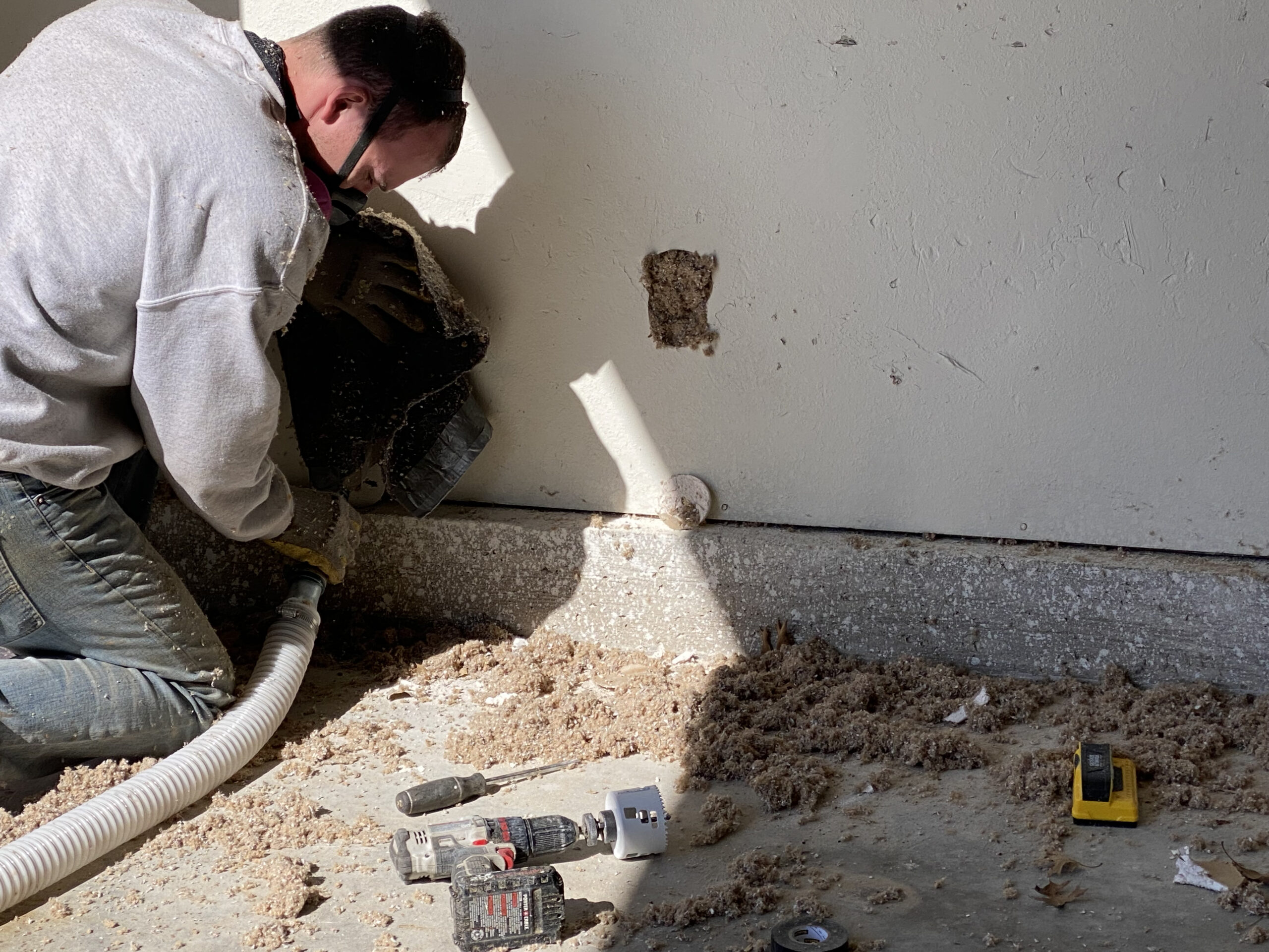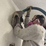 Dense packing these walls also presented another problem. The compromised siding allowed rain into the wall and cause the drywall to become brittle when it dried out. We were still able to get sufficient fill in the wall without blowing the wall out. We dialed the PSI back to 2.5 and the wall will still be well insulated.