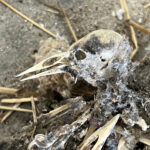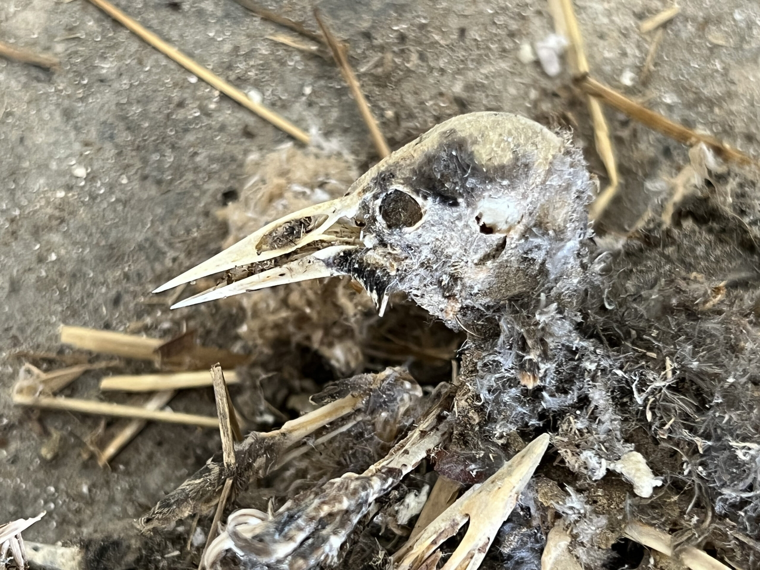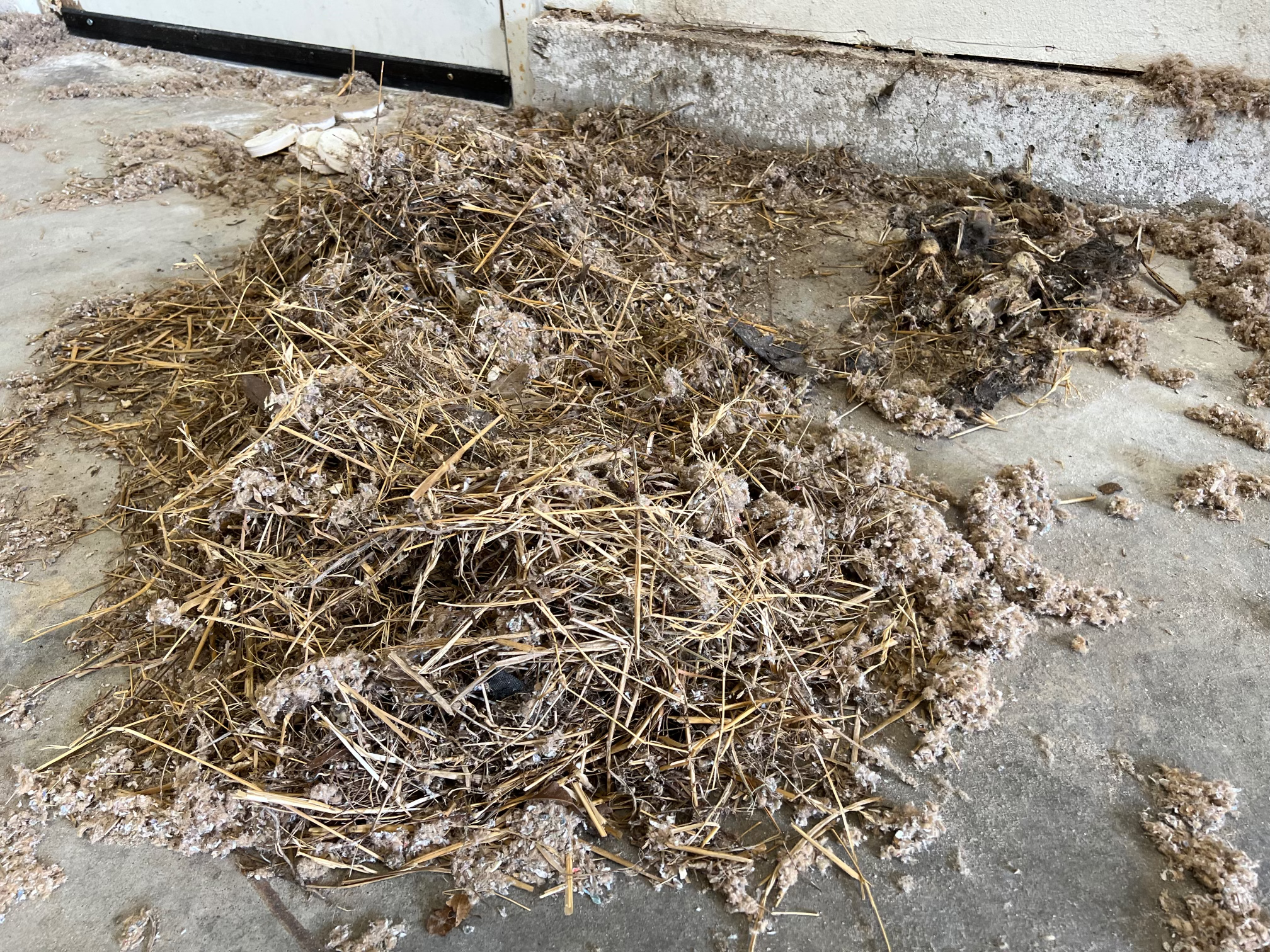- A large mess of nest and skeletons. Up in the wall cavity about 6 feet.